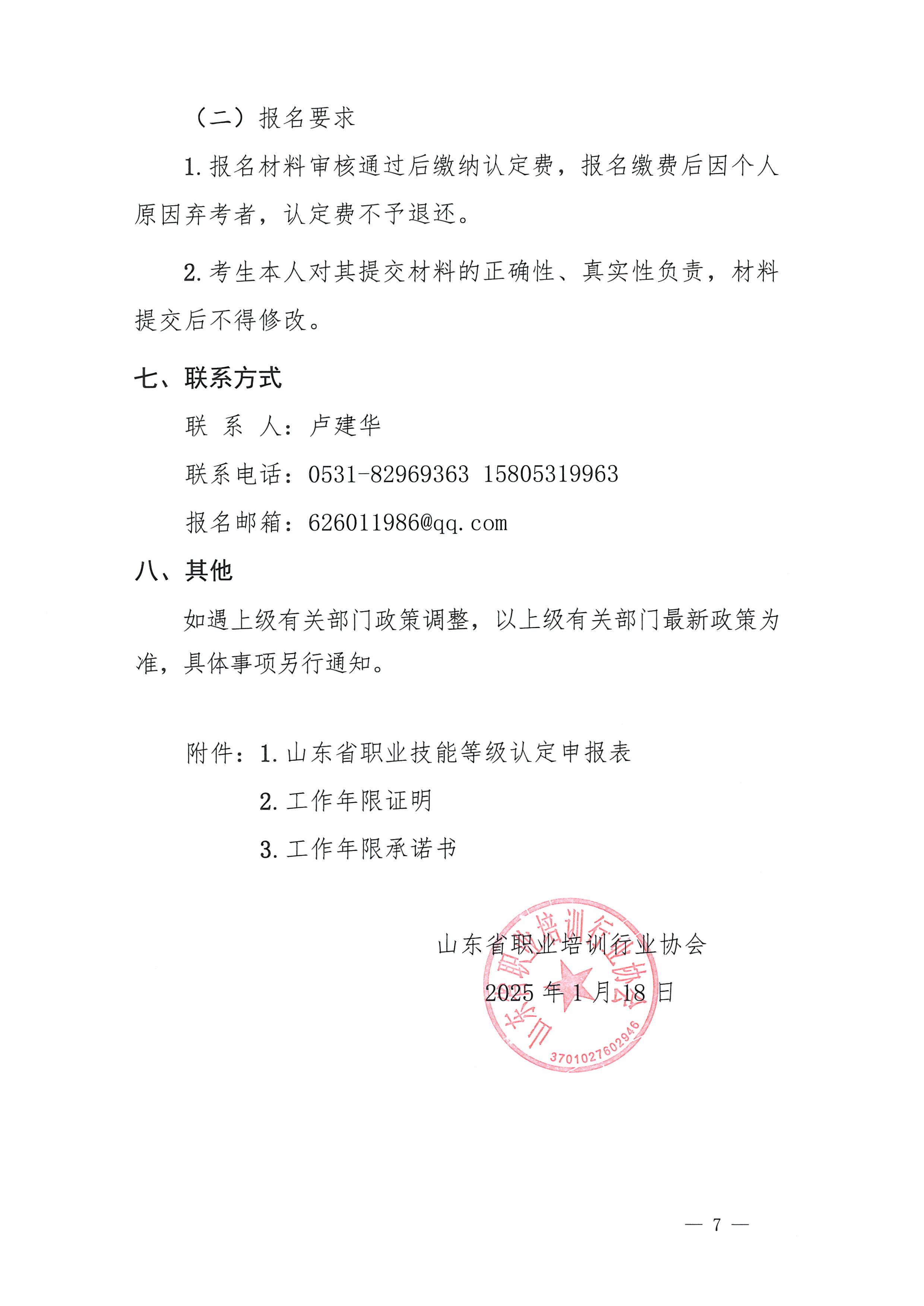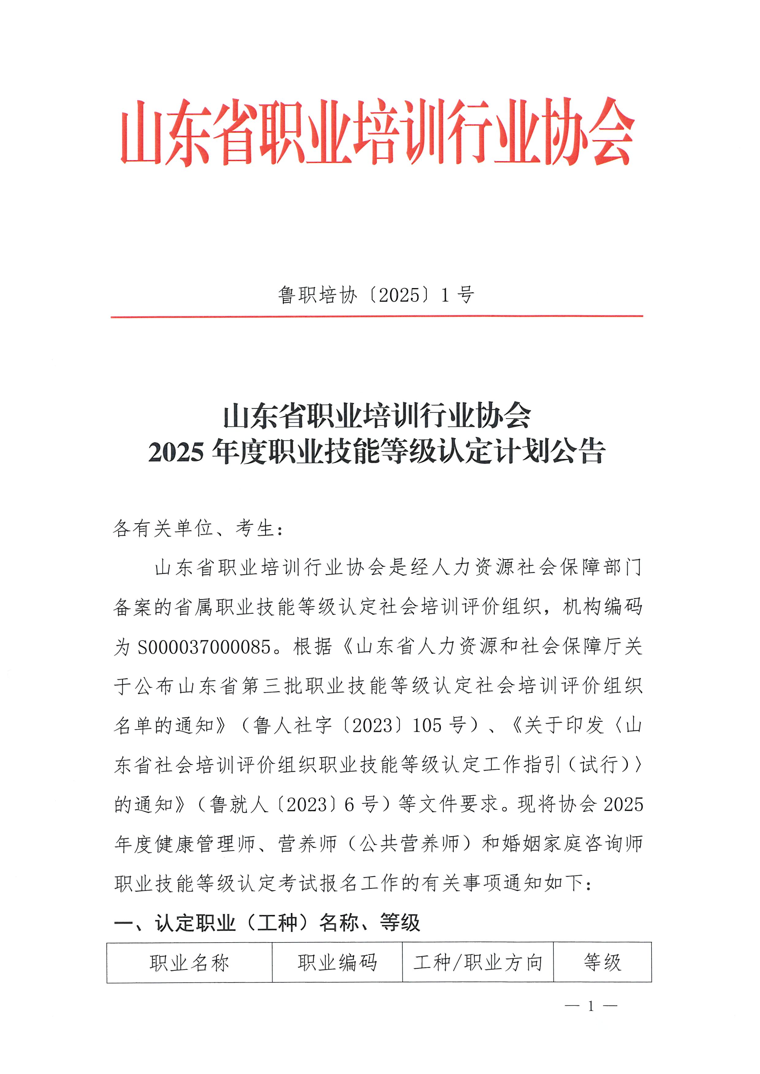 山东省职业培训行业协会2025年度职业技能等级认定计划公告