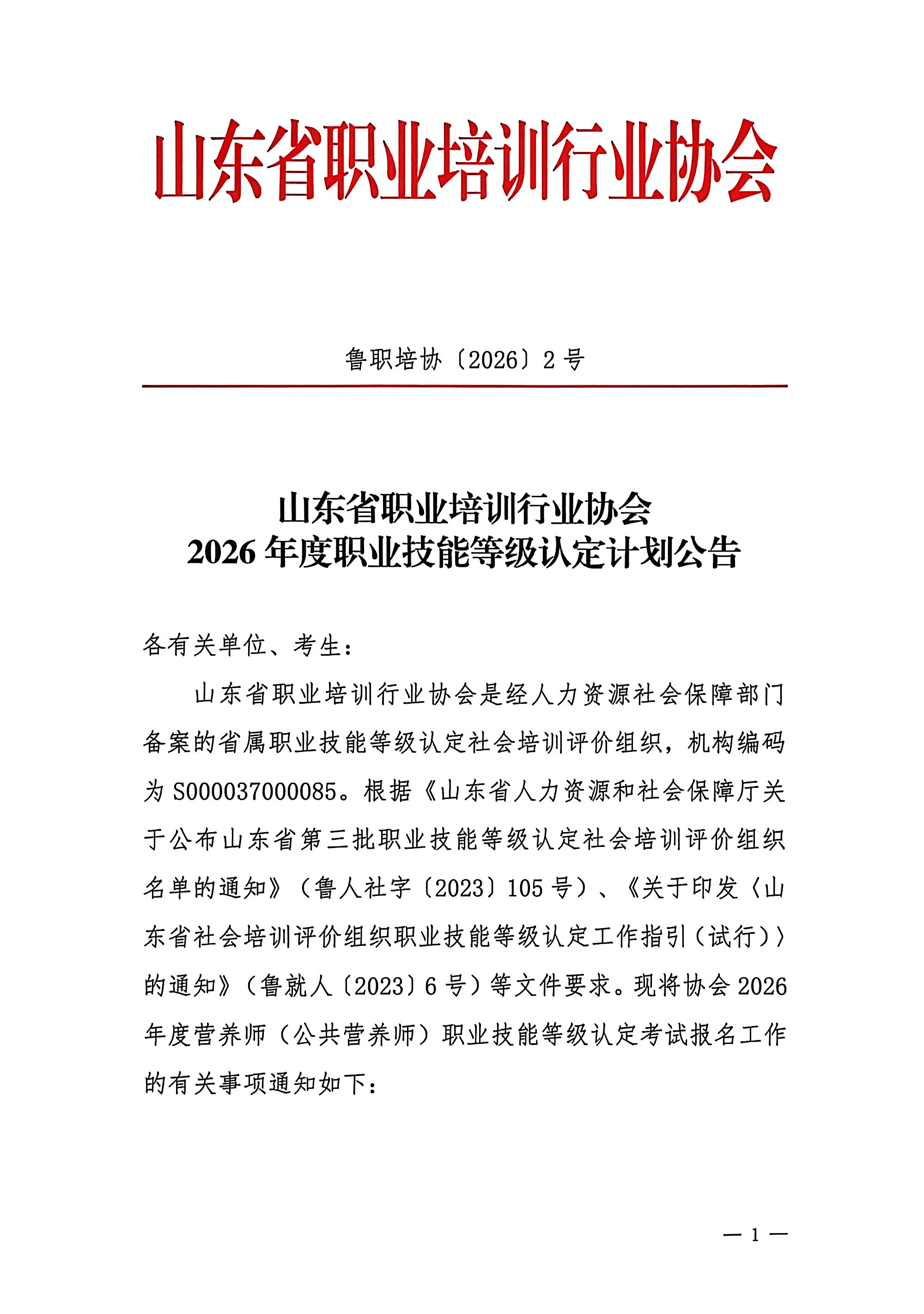 山东省职业培训行业协会2026年度职业技能等级认定计划公告