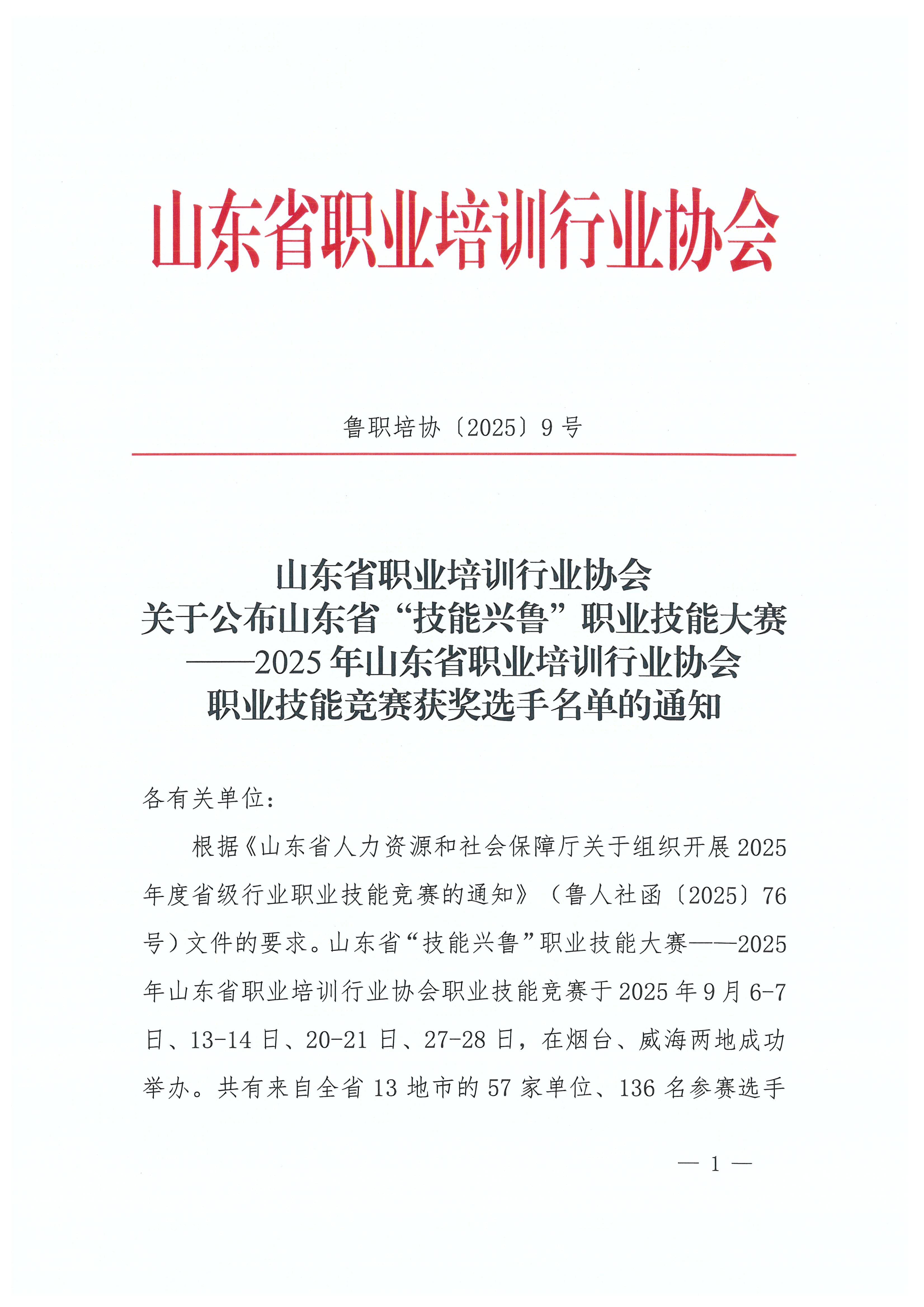 关于公布山东省“技能兴鲁”职业技能大赛——2025年山东省职业培训行业协会职业技能竞赛获奖选手名单的通知