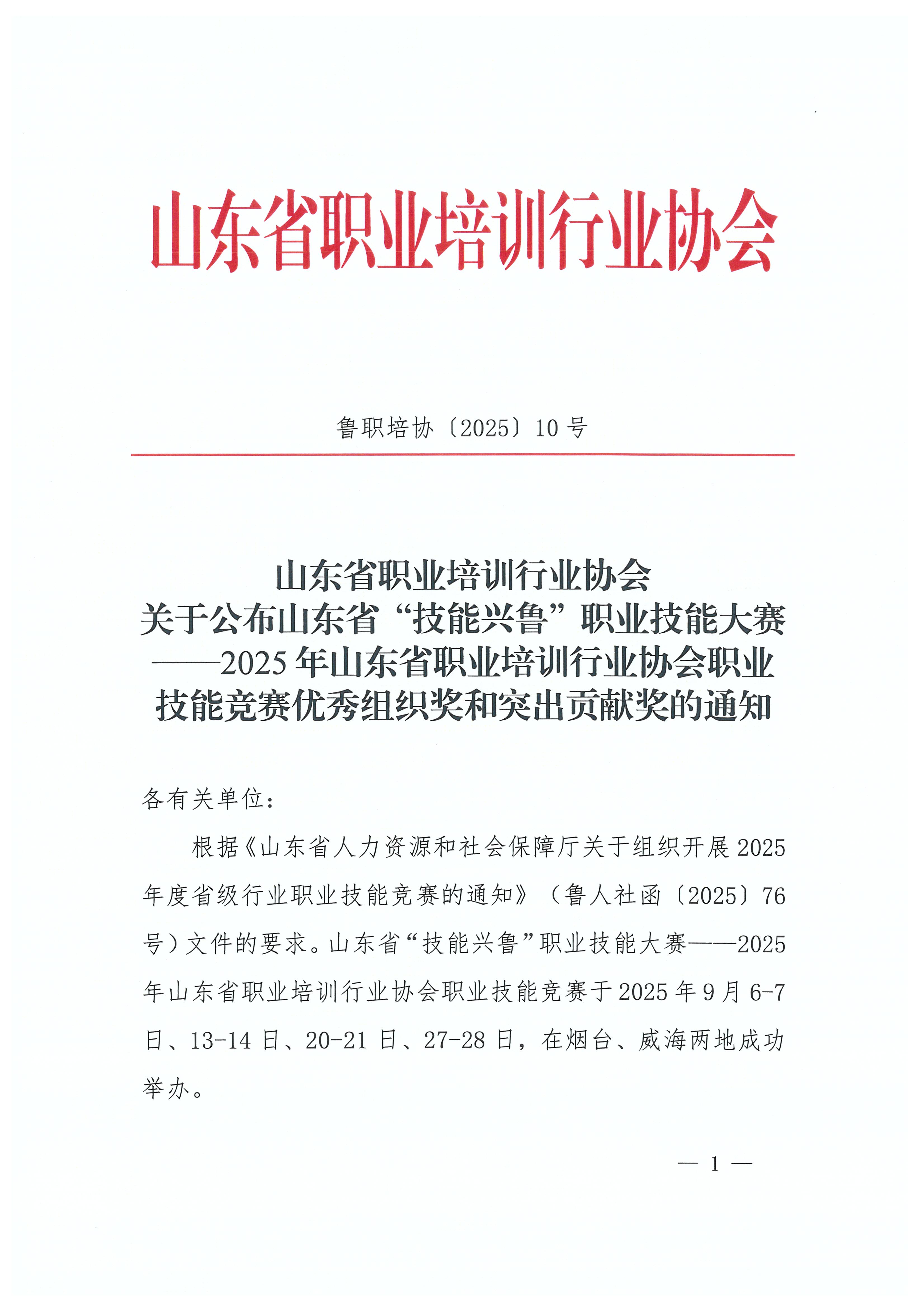 关于公布山东省“技能兴鲁”职业技能大赛——2025年山东省职业培训行业协会职业技能竞赛优秀组织奖和突出贡献奖的通知