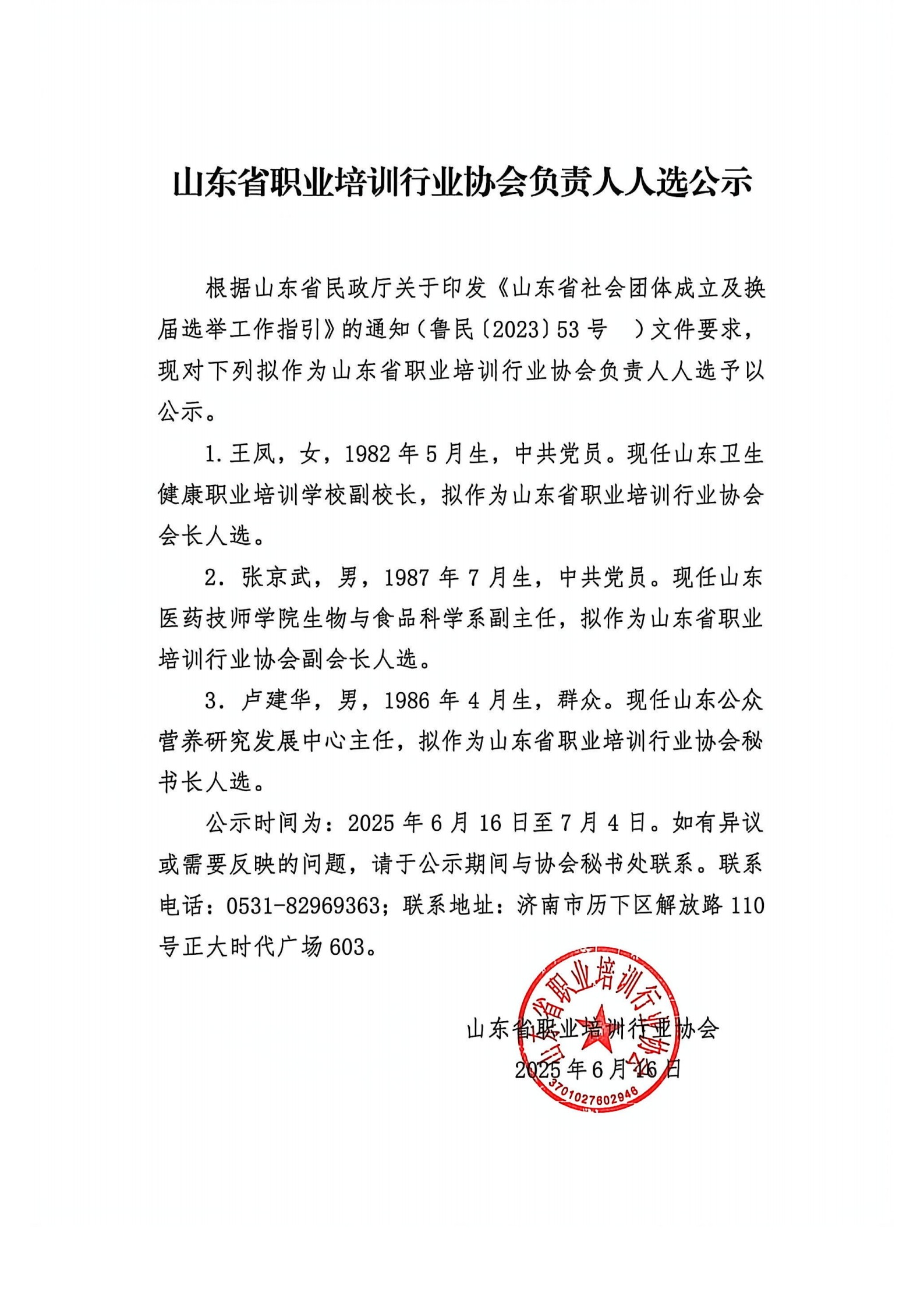 山东省职业培训行业协会负责人人选公示