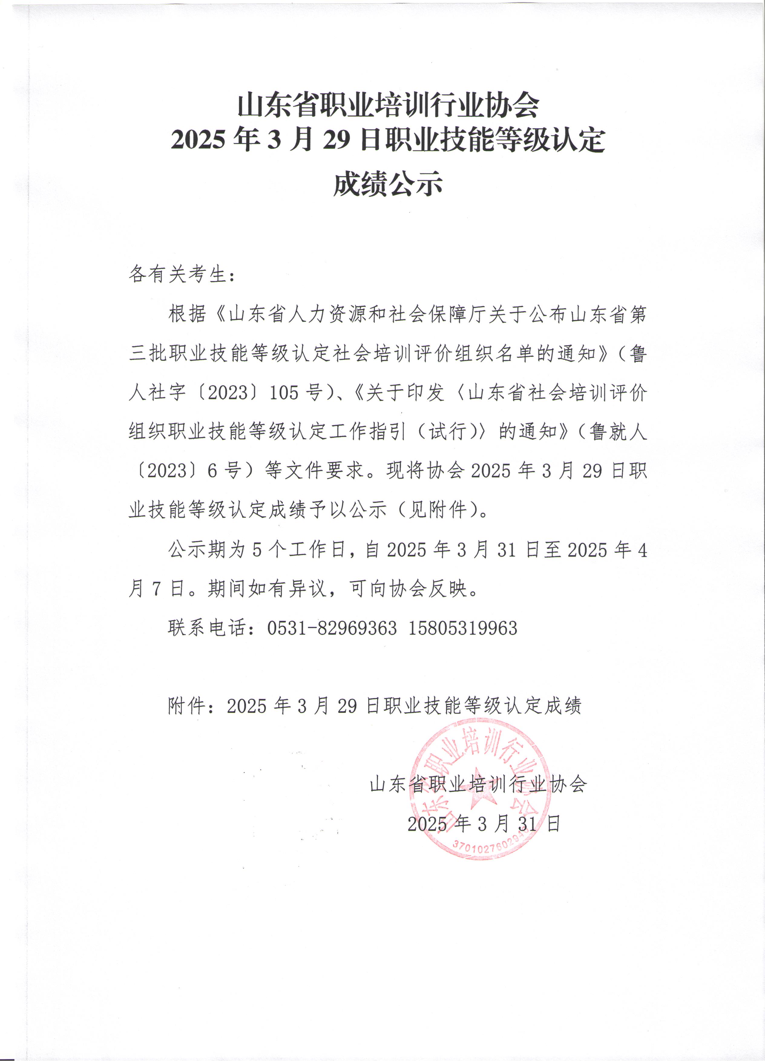 山东省职业培训行业协会2025年3月29日职业技能等级认定成绩公示