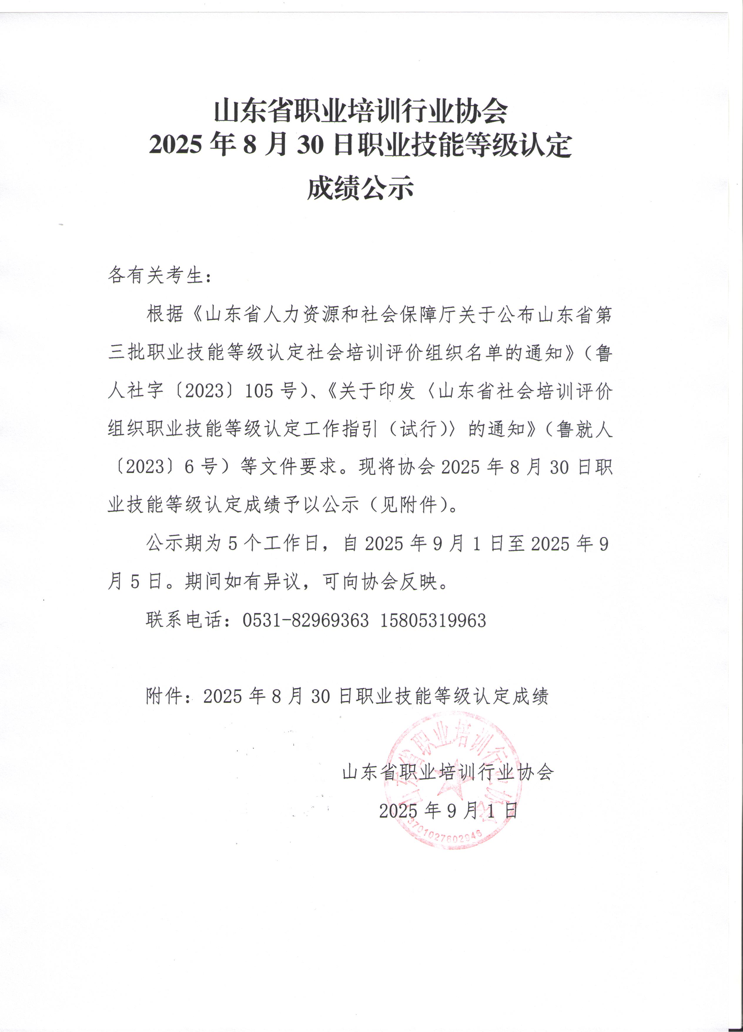 山东省职业培训行业协会2025年8月30日职业技能等级认定成绩公示